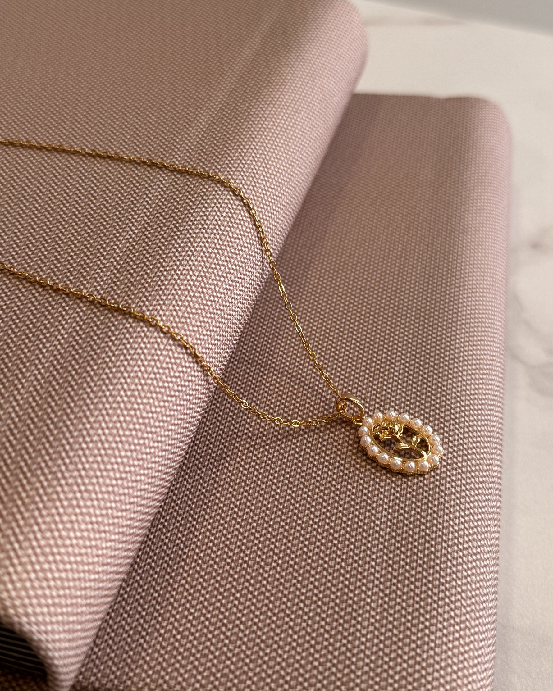 Die Fleur de Perle Halskette vereint romantische Eleganz mit filigranem Design. Der fein gearbeitete Blumenanhänger, umrahmt von zarten Perlen, bringt eine feminine und verträumte Note in deinen Look – perfekt für besondere Anlässe oder als elegantes Detail im Alltag.